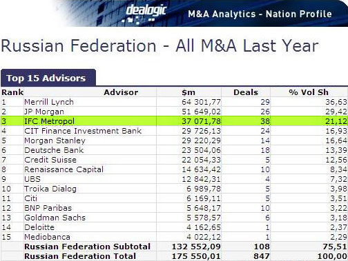 Dealogic company, IFC METROPOL became the leader among the Russian